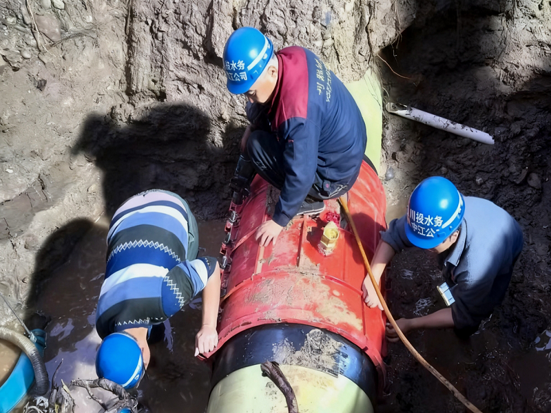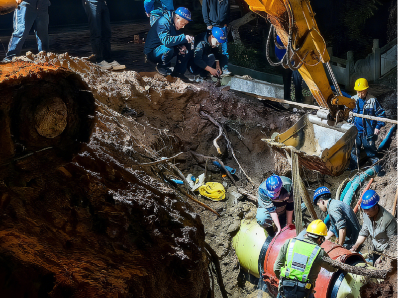 隨后,朱禹迅速按照預(yù)案,成立由其本人擔(dān)任組長、班子其他成員任副組長,工程技術(shù)部、綜合管理部、客戶服務(wù)中心、供水部等部門負(fù)責(zé)人及技術(shù)骨干為成員的搶險指揮部,并下設(shè)兩個搶險小組:第一組由公司常務(wù)副總經(jīng)理秦榮負(fù)責(zé),承擔(dān)中金快通興隆鎮(zhèn)凱歌大道中段供水主管的搶修任務(wù);第二組由公司副總經(jīng)理杜剛、高峰共同負(fù)責(zé),承擔(dān)繼光水廠DN700出水母管的搶修任務(wù)。指揮部確定了 “先控險、再修復(fù)、保民生、兩線同時作戰(zhàn)”的搶險總思路,并立下 “28日早上9時前恢復(fù)縣城區(qū)正常供水”的硬性目標(biāo)。各部門職責(zé)清晰細(xì)化:工程技術(shù)部主攻現(xiàn)場搶修,綜合管理部負(fù)責(zé)信息發(fā)布,客戶服務(wù)中心對接用戶溝通,供水部負(fù)責(zé)供水調(diào)度,全體人員隨即進入“戰(zhàn)時狀態(tài)”,全時輪班投入搶險工作中。